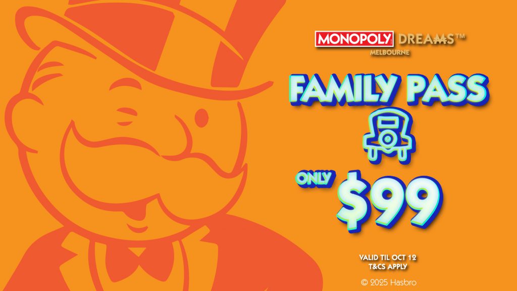 $99 Family Pass – How to Redeem Head to the Book Now page on the MONOPOLY DREAMS Melbourne website. Select your preferred date (must be on or before 12 October 2025) and time, then… MORE